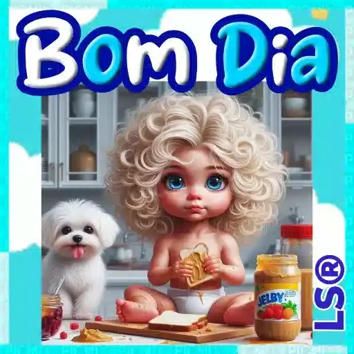 Uma menina de cabelo loiro encaracolado e um cachorro branco ao lado, comendo torrada com manteiga de amendoim, em uma cozinha. A imagem tem o texto 'Bom Dia' em cima.