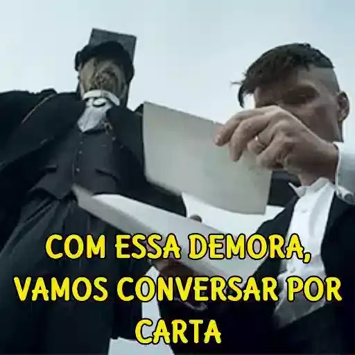 Dois homens de terno, um ao lado do outro, com o homem da direita segurando um envelope e o homem da esquerda com a mão na boca. O texto 'COM ESSA DEMORA, VAMOS CONVERSAR POR CARTA' aparece em amarelo na parte inferior.