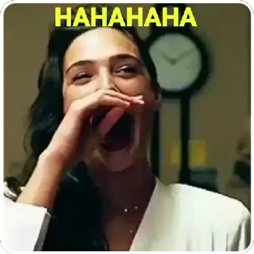 Uma mulher de cabelo escuro e blazer branco ri alto, cobrindo a boca com a mão. O texto 'HAHAHAHA' aparece em amarelo acima dela.