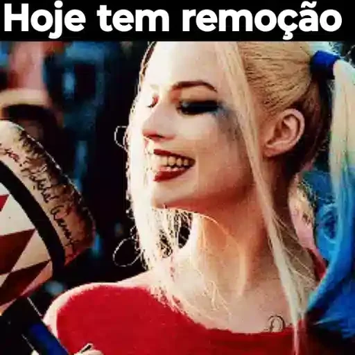 Harley Quinn com um martelo, sorrindo, com a frase 'Hoje tem remoção' em cima.