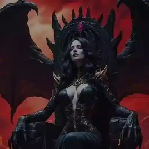 Uma mulher com cabelos pretos e asas de morcego sentada em uma pose poderosa, com um fundo vermelho e laranja. Ela parece uma rainha ou deusa sombria.