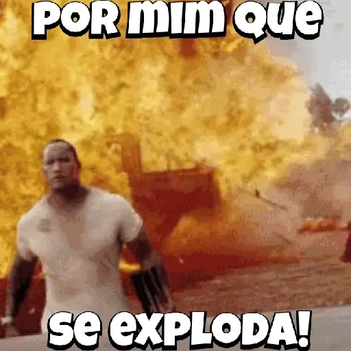 Um homem nu em chamas com fundo de explosão, legenda 'POR MIM QUE SE EXPLODA!'