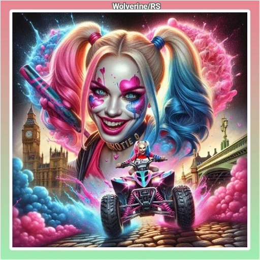 Uma imagem colorida da Arlequina com penteados em dois coques, maquiagem branca e rosa, sorrindo e segurando um taco de beisebol. Ela está em frente a um quadriciclo e ao fundo tem uma cidade com uma torre de relógio.