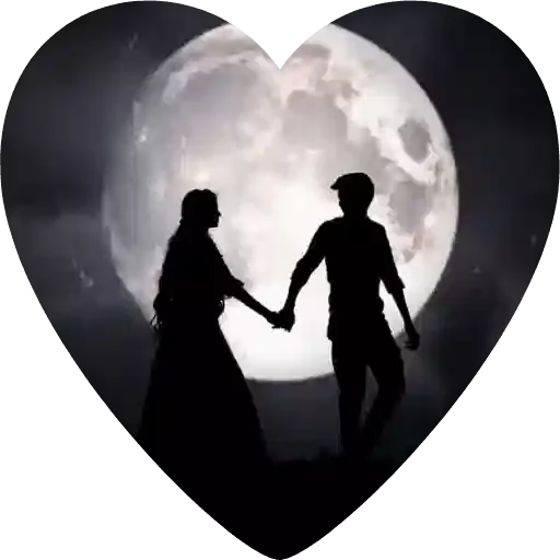 Um casal de silhuetas segurando as mãos em frente à lua cheia, dentro de um coração.