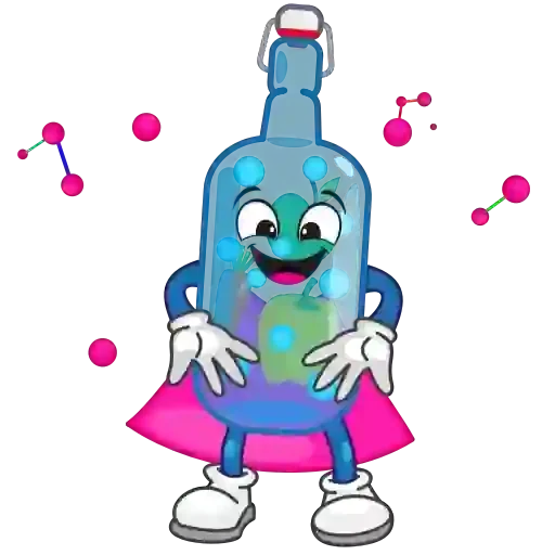 Um desenho de uma garrafa de álcool colorida e animada com um sorriso largo e uma capa rosa, cercada por moléculas.