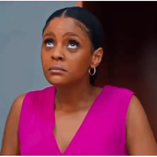 Mulher negra com expressão de surpresa ou preocupação, vestindo um blazer escuro, em um ambiente com cortina ao fundo.