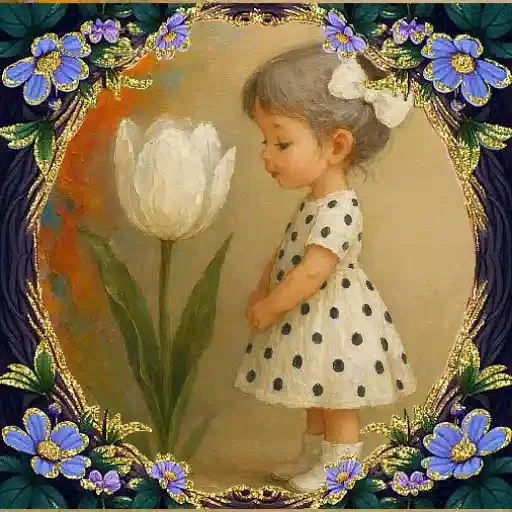 Menina com vestido branco de manchas pretas olha uma tulipa branca, enquadrada por flores azuis e roxas.