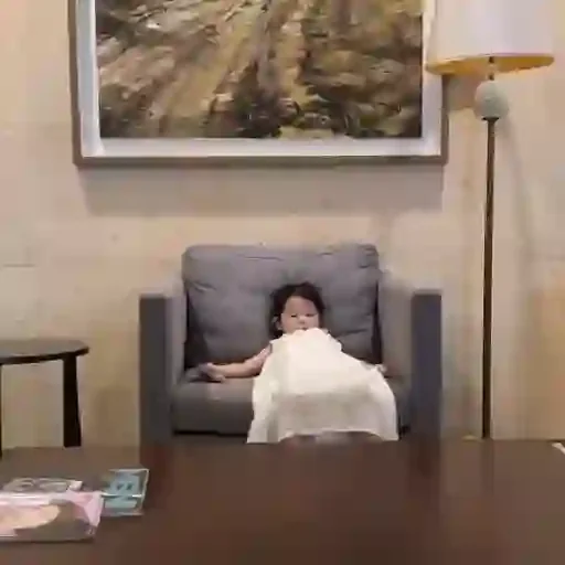 Um bebê está deitado debaixo das cobertas com apenas um olho e uma mão visíveis. A coberta é branca com flores rosa.