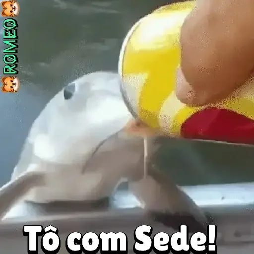 Um golfinho cinza beba água de uma garrafa de refrigerante. A garrafa é amarela com listras brancas e vermelhas. O texto 'Tô com Sede!' aparece embaixo.