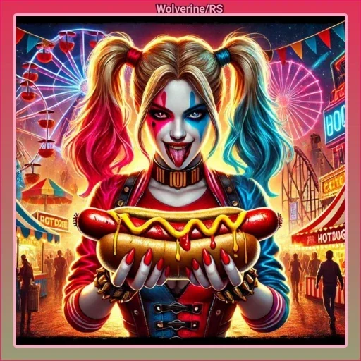 Harley Quinn segurando um cachorro-quente em um parque de diversões colorido com uma roda-gigante ao fundo.