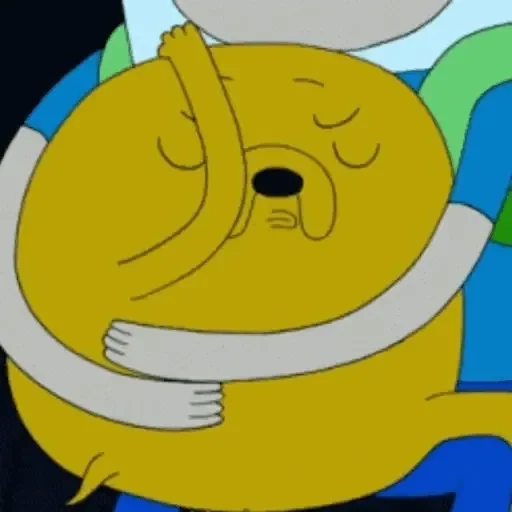 Um desenho de Finn e Jake, personagens de Adventure Time, se abraçando. Finn tem uma camisa azul e cabelo branco,…