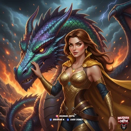Uma mulher com armadura dourada e cabelos castanhos longos está ao lado de um dragão colorido com chamas ao fundo.