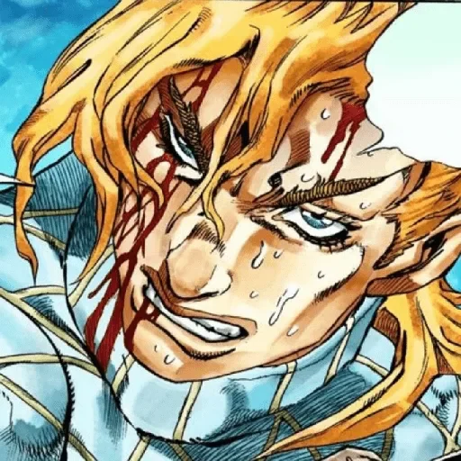 Personagem de anime com cabelo loiro e ferido, sangue no rosto e suor.