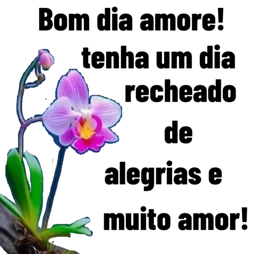 Uma flor de orquídea roxa com folhas verdes e um texto que diz 'Bom dia amore! tenha um dia recheado de alegrias e muito amor!'.