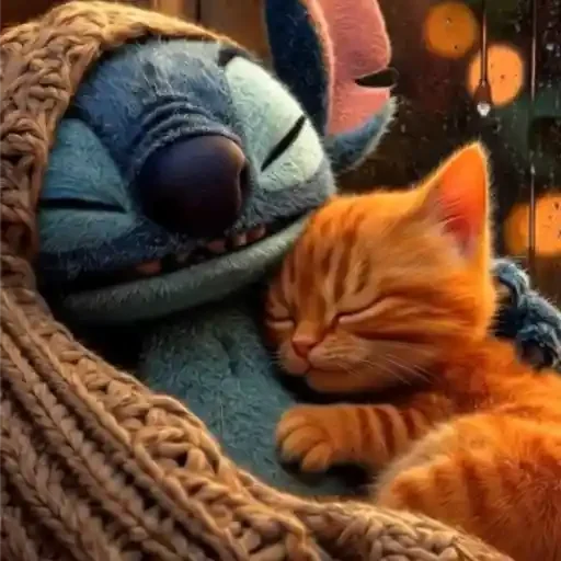 Stitch e um gato laranjado dormindo juntos, cobertos por um cobertor de tricô. Stitch tem um olho fechado e o outro semicerrado.