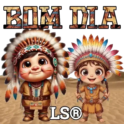Dois personagens de desenho animado vestidos com trajes indígenas, um menino e uma menina, com a frase 'BOM DIA' em letras grandes acima deles.