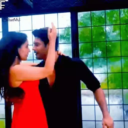 Um casal dançando, a mulher de vestido vermelho e o homem de preto, com uma janela ao fundo.