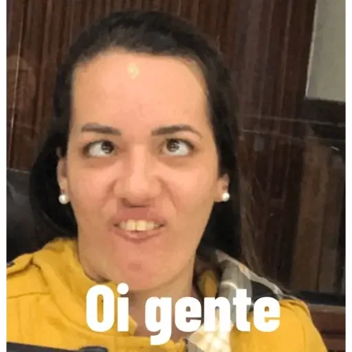 Uma mulher de cabelo preto e olhos castanhos sorri e diz 'Oi gente' em uma camiseta amarela.