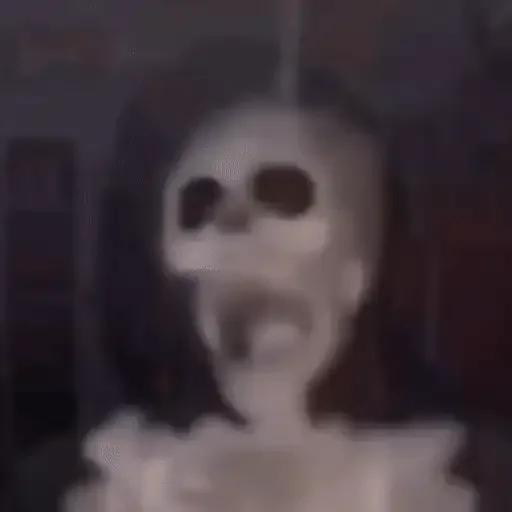 Uma caveira com olhos grandes e redondos, parecendo assustado ou surpreso, contra um fundo preto.