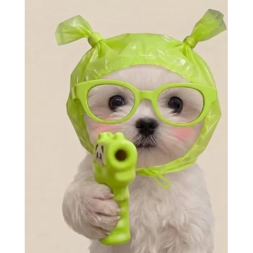 Um cachorro branco usando óculos e um capacete verde, segurando uma pistola de brinquedo verde.