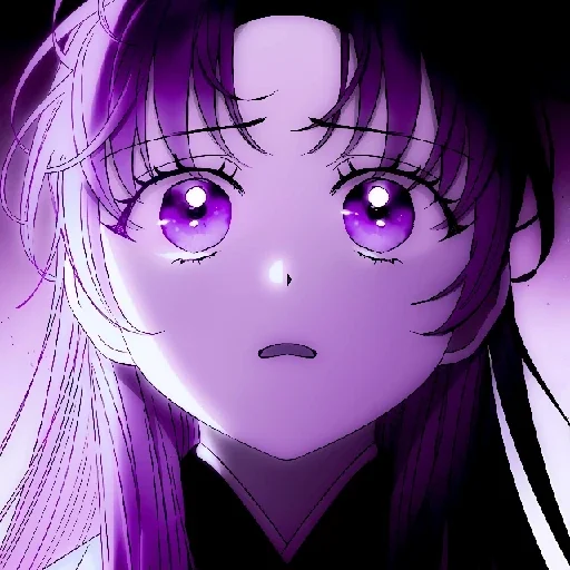 Rosto de uma jovem mulher com olhos roxos grandes e expressivos, cabelos roxos e pretos, e uma expressão de surpresa ou preocupação.