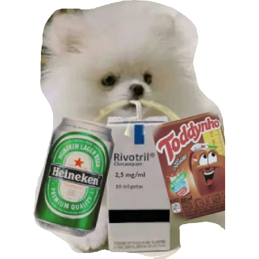 Um cachorro branco fofinho bebendo de um tubo de Rivotril, com uma embalagem de Heineken e um pacote de Toddyinho ao lado.