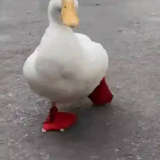 Um pato branco com bico amarelo e patas vermelhas grandes e engraçadas
