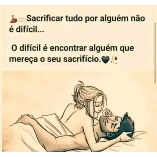 Uma mulher deitada com um homem nos braços, com um coração. Legenda: 'Sacrificar tudo por alguém não é difícil... O difícil é encontrar alguém que mereça o seu sacrifício.'