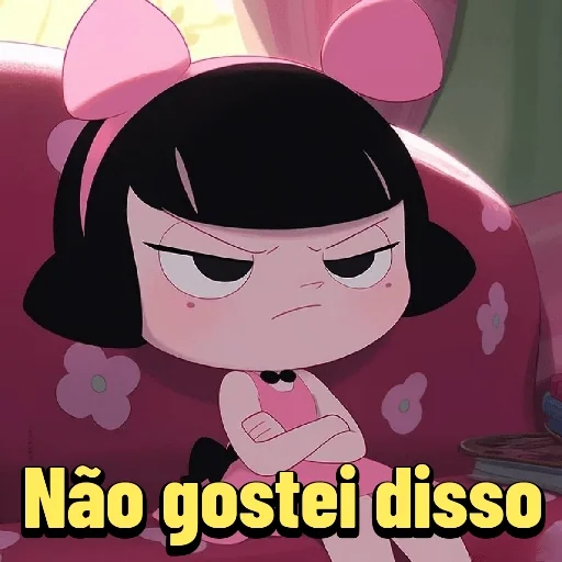 Uma menina de anime com cabelo preto e um laço rosa na cabeça, com expressão de desaprovação. Ela está sentada em um sofá rosa com a frase 'Não gostei disso' em amarelo na parte inferior.