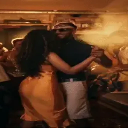 Um casal dançando em um ambiente noturno, com o homem vestindo um boné e óculos de sol e a mulher com um vestido laranja.