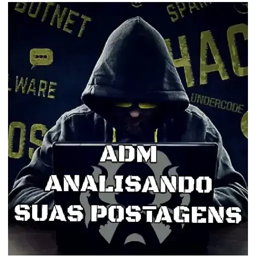 Um homem de capuz, com olhos verdes, está sentado em frente a um computador com uma expressão séria. Ele veste uma jaqueta preta com uma estampa branca no peito. No centro da imagem, há o texto 'ADM ANALISANDO SUAS POSTAGENS'.