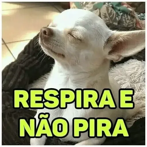 Um cachorro branco com os olhos fechados e a expressão relaxada, com o texto 'RESPIRA E NÃO PIRA' em letras amarelas.