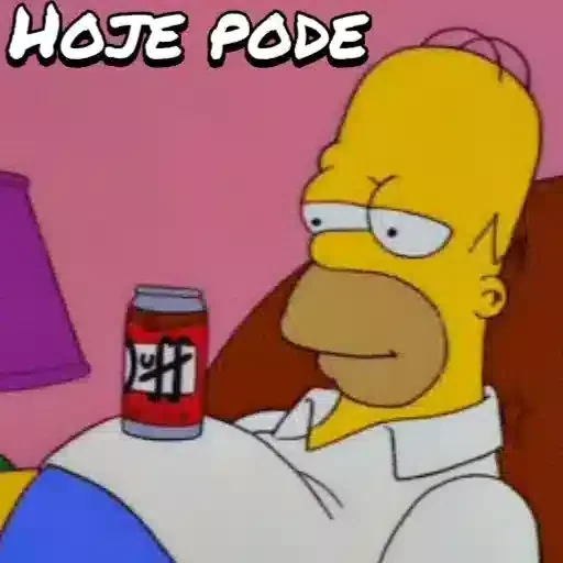 Homem de camisa branca e calça azul, com uma lata de cerveja Duff, em uma poltrona, com a frase 'HOJE PODE' em cima.