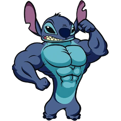 Stitch com músculos exagerados, mostrando os bíceps e abdômen definidos, com um sorriso malicioso no rosto.