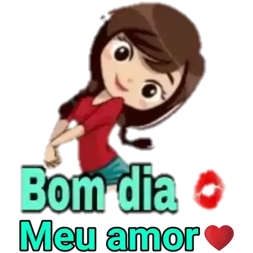 Uma garota de cabelos castanhos e olhos grandes sorri com um gesto de braço, ao lado de um beijo e um coração. O texto 'Bom dia Meu amor' está escrito abaixo.