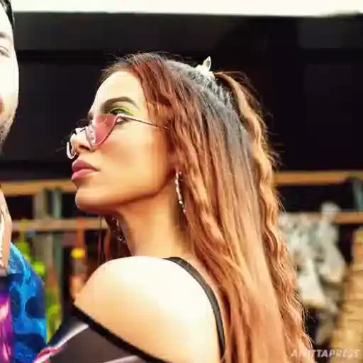 Uma mulher com óculos escuros e headphones, parecendo uma DJ ou produtora musical, em um ambiente com iluminação azul e…