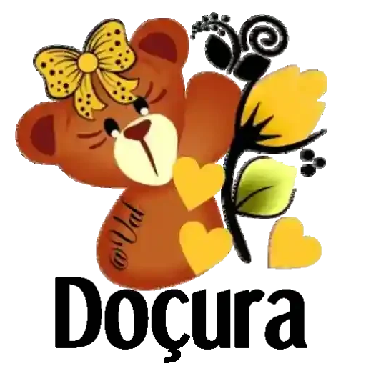 Um ursinho de pelúcia marrom com um laço amarelo no cabelo e um buquê de flores amarelas e verdes, com corações ao redor. A palavra 'Doçura' está escrita abaixo.