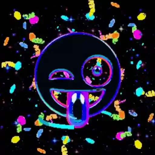 Um rosto de emoji preto com um sorriso largo e um olho aberto, cercado por confetes coloridos.
