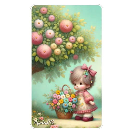Menina fofa com vestido rosa olhando para uma cesta de flores coloridas em frente a uma árvore florida com maçãs.