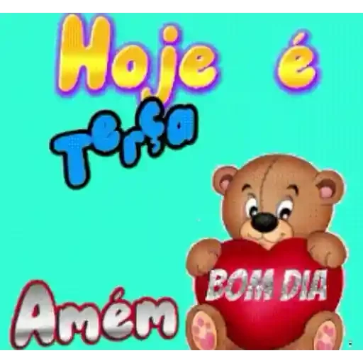 Um ursinho de pelúcia marrom com um coração vermelho que diz 'Bom Dia' está sentado em um fundo verde. O texto 'Hoje é Terça Amém' está escrito em diferentes cores acima e abaixo do ursinho.
