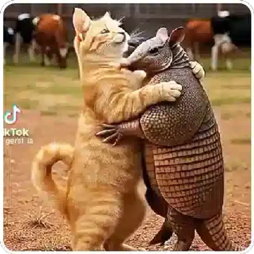 Um gato laranja e um tatu se abraçam em um campo com vacas ao fundo. O gato tem as patas cruzadas em volta do tatu.