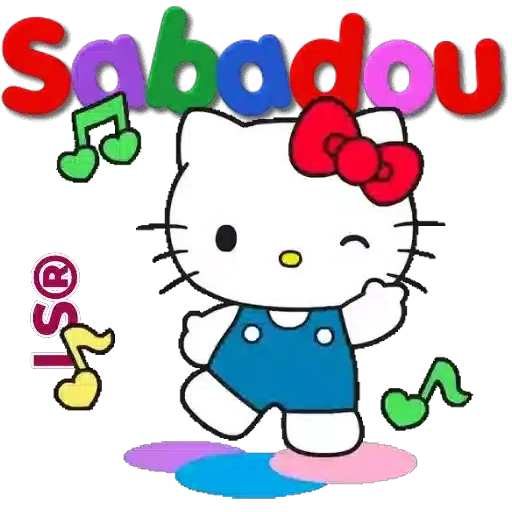 Hello Kitty dançando com a palavra 'Sabadou' em cores arco-íris e notas musicais.