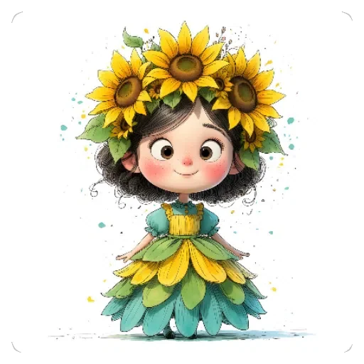 Menina fofa com vestido de folhas e flores de girassol na cabeça, coroa de girassóis, sorriso largo e bochechas rosadas.