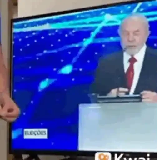 Um homem de meia-idade com cabelo grisalho e terno, com uma gravata vermelha, aparece em uma tela de TV com um fundo azul e estrelas. A imagem parece um pouco desfocada.