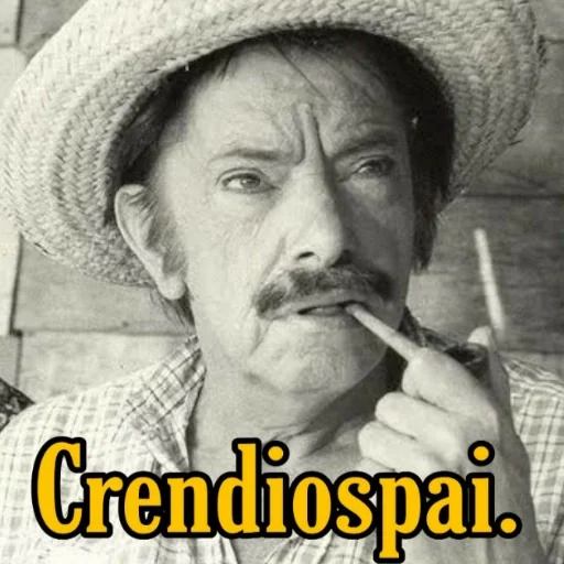 Homem com chapéu de palha e bigode, fumando e fazendo careta, com o texto 'Crendiospai' em amarelo.
