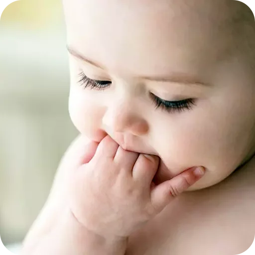 Um bebê com a mão na boca e expressão pensativa, com os olhos semicerrados.