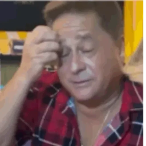 Homem com camisa xadrez vermelha e preta, com a mão no rosto e expressão de alívio ou surpresa, com lágrimas no rosto.