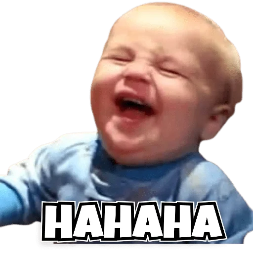 Um bebê com os olhos fechados e a boca aberta, rindo. A imagem tem o texto 'HAHAHA' em letras grandes.