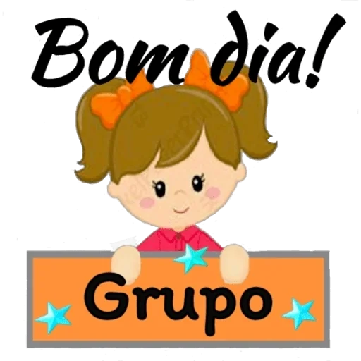 Menina de cabelos castanhos e um laço laranja, com uma blusa rosa, sorrindo e segurando um cartaz laranja com as palavras 'Bom dia!' e 'Grupo'.