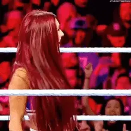Uma mulher com cabelo vermelho longo está em um ringue de luta, com uma multidão ao fundo. A iluminação é vermelha e há cordas brancas no ringue.